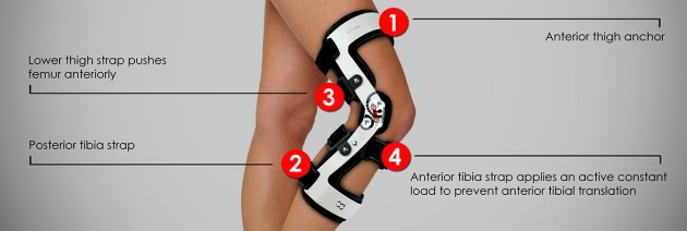 - the fourth point is the strap on the front of the calf, which gives preload on the tibia by pushing it aback. This solution decreases the ACL tension.