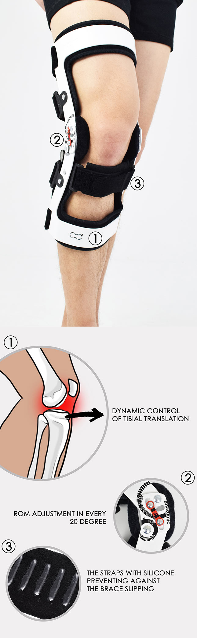 KNEE LIGAMENT BRACE WITH ANATOMIC ROM ADJUSTMENT