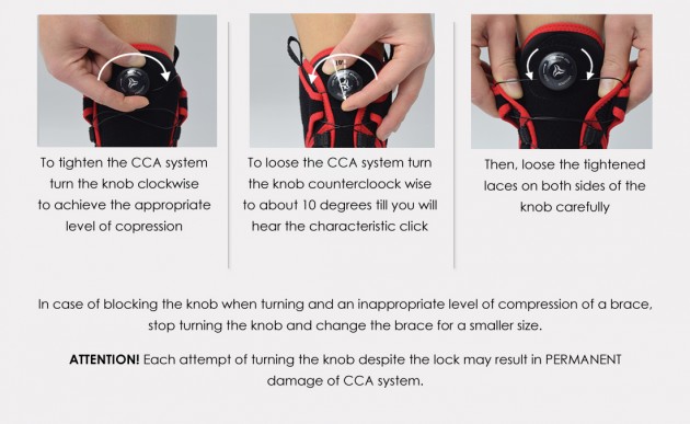 Dial CCA Compression System was designed to use it in the snowboard shoes , because ordinary shoelace was too weak in extreme using. Typical shoestring sprang and snowboard shoes wasn’t casing construction what could allow using the steel fastening. Steel wire and polyamide grommets allow to use steel fastening. Later, this system was used in other sport shoes such as: professional shoes for cycling or running. In orthopaedic field the compression system was adapted early and it’s used in e.g. ankle, wrist or back braces. The system is characterized by firm fastening that is non-elastic, easy and secure. There is impossible to loose (only in case of damage) it what guarantees the best stabilization. Our CCA System provides different levels of compression. It’s based on differential polyamide grommets , steel wires covered by plastic and knobs. The additional equipment is the special element that is easy to attach what allows to modify device’s shape or circumference. The CCA System is the compression solution so you can use it only after putting the brace on the body.