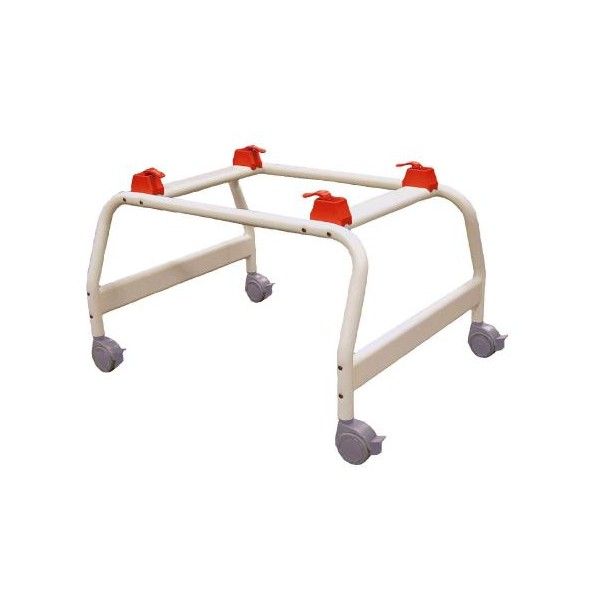 This optional Otter Shower Stand holds the Otter Bath Chair securely on its frame with quick-release locks. The aluminum frame height is 21" (53.3 cm) for easier transfers, as well as for use in the shower. It measures 27" (68.6 cm) wide by 33" (83.8 cm) long at the base. The weight capacity is 200 pounds. The Otter Shower Stand comes complete with 4 swivel locking casters. Some assembly is required.