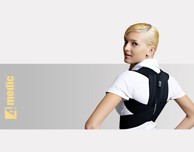 Up-right holder is made of elastic tapes and back pelotte, equipped with 4orthopaedic nibs. Back pelotte is attached to the elastic shoulder tapes going through the shoulders and crossing in the loins area of the spine and fastened on the belly. Such construction of the product guarantees correction of the posture for adults as well as children. Special lining protects the tapes from rippling and makes the tape stick to the patient’s body.