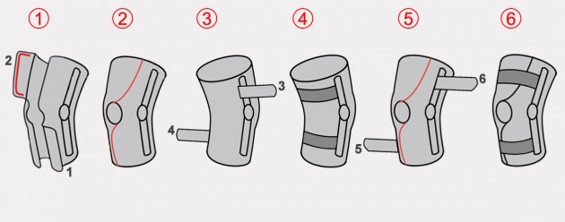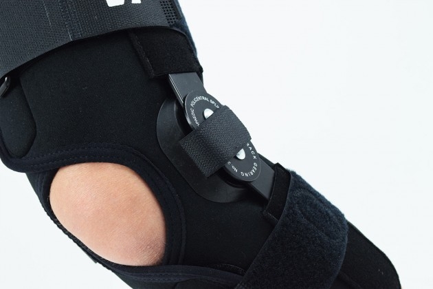 Splints [2] – double-axis polycentric splints equipped with rack and pinion, which reflects the anatomic movement of the knee joint. It is made of high quality aluminium alloy, with durable sanded cover, which protects the splint from influence of sweat and salt. Splint is equipped with specially shaped silicone insert to stabilize the splint and additionally release stress from the knee joint.