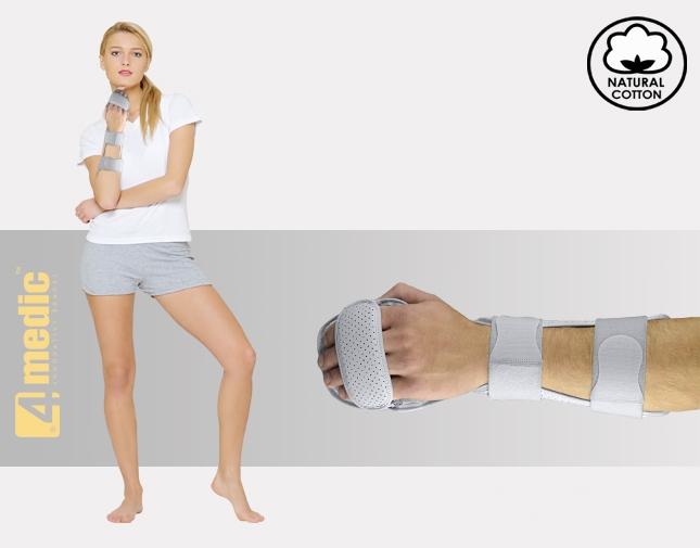 Positioning forearm and hand support with finger separation was developed for positioning treatment and immobilization of contractures of the wrist, radiocarpal joint and fingers. Positioning forearm and hand support with fingers separation AM-SN-LMThe fitting of the Positioning Forearm and Hand Support is obtained by 2 sets of circumferential forearm tapes and palm strap, which ends of closure are provided with Plastic Covers, specially developed for patient with limited dexterity, such as osteoarthritis and wrist instability. Dorsal Band on Fingers provides support on phalangeal area. The product is supplied with soft fingers separator, which prevents to fingers overlapping, anti-spasticity, relieves pain fingers and keeps them in correct position. Per customer request, the standard separator may be substituted for neurological separator which stabilizes each finger separately. Positioning forearm and hand support with fingers separation AM-SN-LMOrthosis is made of innovative AirSanmed non-elastic textile, which properties allows an improvement in stabilization level of the joints. The orthosis is covered with perforated medical laminate allowing easy evaporation of the sweat, semi-rigid comfort foam located inside and breathable cotton terry cloth in contact with the skin of patient.
