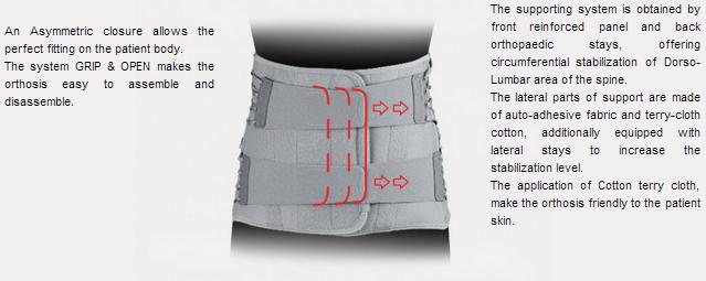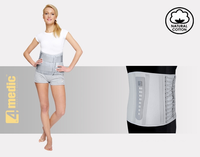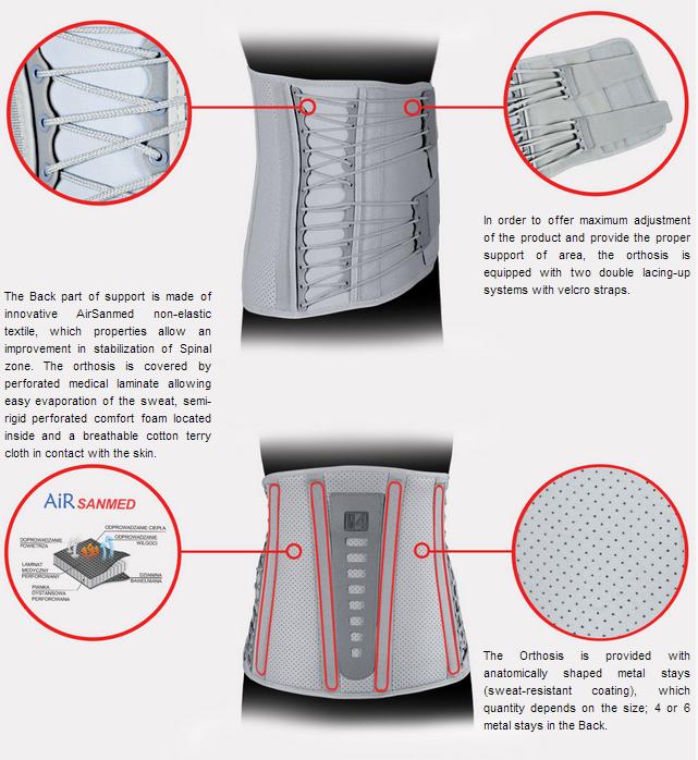 Lace-up Dorso-Lumbar Back Support AM-WSP-03 was made of non-elastic materials, as well as provided with lace-up system which function is to improve the functionality, stabilization level and comfort for the patients during its use.