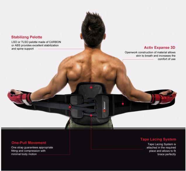 The TLS System is a combination of metal grommets, nylon tapes and Velcros. The additional equipment is the special element that is easy to attach what allows to modify device’s shape or circumference. You can achieve required compression with a single pull strap. One easy pull securely forms the brace to the patient’s torso and provides intra-abdominal compression, reducing the load on intervertebral discs.