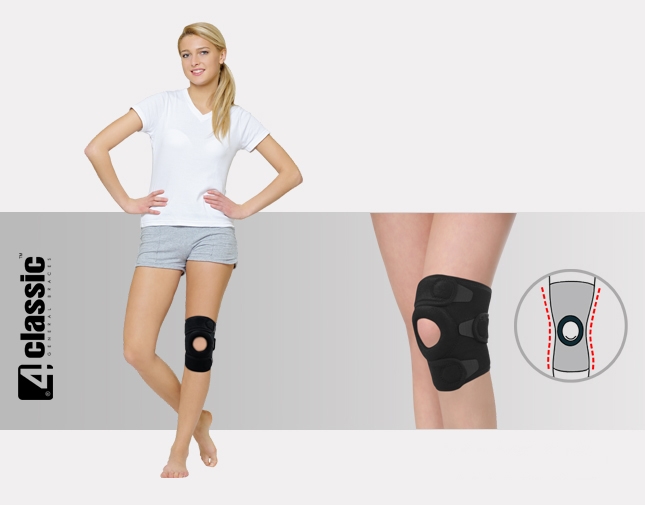 Short knee brace U-SK-02 belongs to 4CLASSIC group and has universal size. Anatomic kneecap support stabilizes patella and prevents its dislocation. Such properties allow to use it during sport activities.