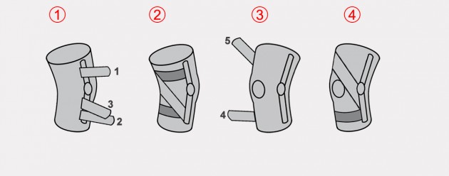 The third one is the spiral strap connected with the hinge and 2 straps above and under joint axial (on the femur and tibial condyles) – this solution reduces 50% pressure straps on the shin and thigh on the opposite site to supported.