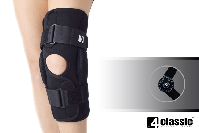 The open knee brace is made of perforated perforated neoprene foam, which is coated with lining fabric. It holds two independent supported sets of the Velcro tapes. The device is equipped with two sides splints, which are made of carbon fibres and consists of special drop lock allowing for ROM adjustment in every 15°. this precise adjustment facilities the rehabilitation process. The system of splints in open knee brace is arranged in a shape of X letter, which allows to adhere perfectly to the limb and also enables to stabilize the joint precisely. This internal perforation allows skin to breath and reduces overheating. The open construction enables to use the brace by seniors or overweight people.
