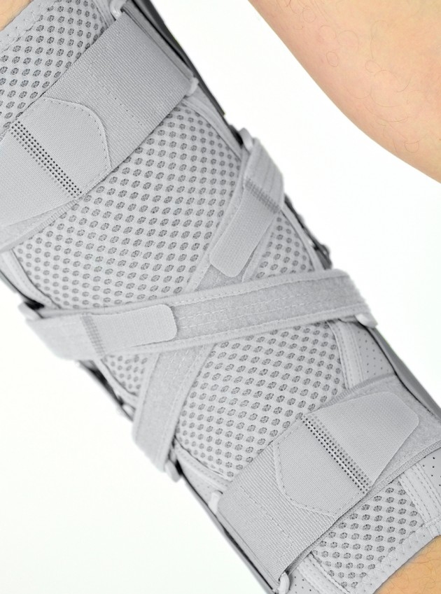 The device is equipped with two independent support straps made of VELCRO tapes and two 2-axial sides anatomic splints 2RA, providing hyperextension block in 15° extension in 75° and immobilization possibility.