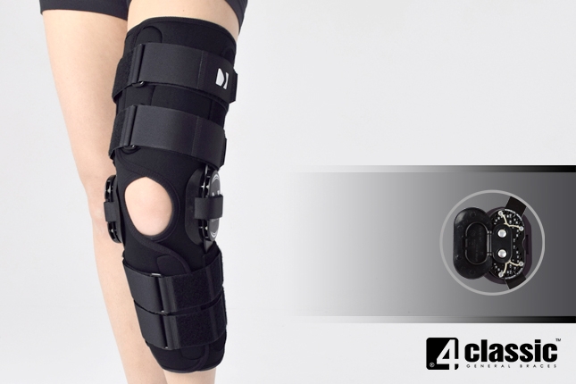 AM-OSK-OL/2R is the open brace, made of perforated neoprene foam, which is coated with lining fabric. This internal perforation allows skin to breath and reduces overheating. It has four independent sets of Velcro straps. The device is provided with 2-axial sides splints with a rack mechanism and adjustment. The flexion and extension angle can be adjusted in every 20°. Splint are made of high quality alloy of aluminium coated with permanent powdery cover. Length of splints and their system which is arranged in a shape of X letter, it allows to adhere perfectly to the limb and also enable to stabilize the joint excellently. Such precise adjustment of the device facilitates the process of rehabilitation of injured knee joint.
