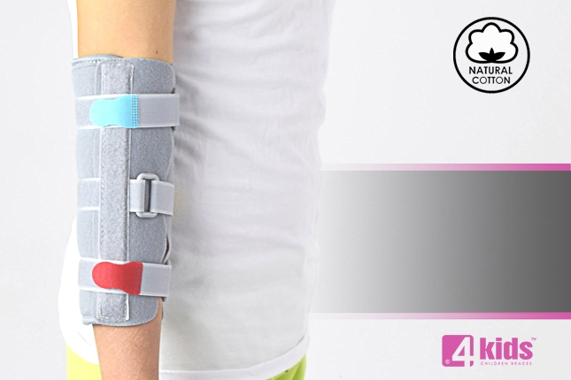 - Children’s elbow immobilizer is made of light materials and has internal cotton terry surface, which helps skin to breath. The elbow brace has anatomical splints, which immobilize the joint, so it can be used as an alternative to traditional cast.