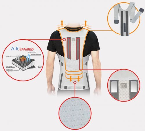 - The Back part of support is made of innovative AirSanmed non-elastic textile, which properties allow an improvement in stabilization of Spinal zone. The orthosis is covered by perforated medical laminate allowing easy evaporation of the sweat, semi-rigid perforated comfort foam located inside and a breathable cotton terry cloth in contact with the skin. In order to avoid any pressure of internal metal frame on spine, the thickness of foam was modified accordingly.